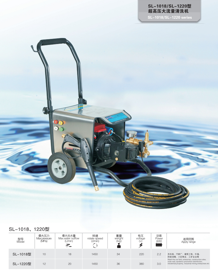 上海神龍集團生產(chǎn)的高壓清洗機SL-1018/SL-1220型超高壓大流量清洗機,適用洗車場、汽修廠、建筑工地、外墻、防疫消毒、小區(qū)物業(yè)、工礦企業(yè)等。