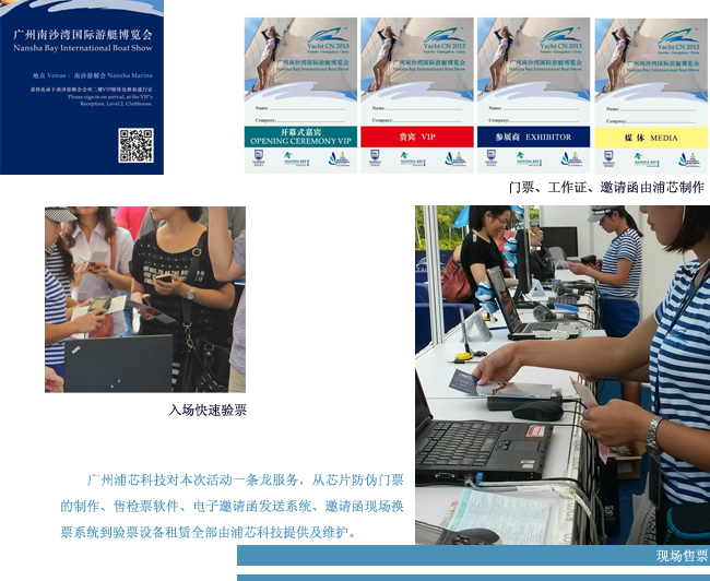 2013南沙灣國際游艇博覽會防偽門票制作及票務系統由廣州市浦芯電子科技有限公司提供。