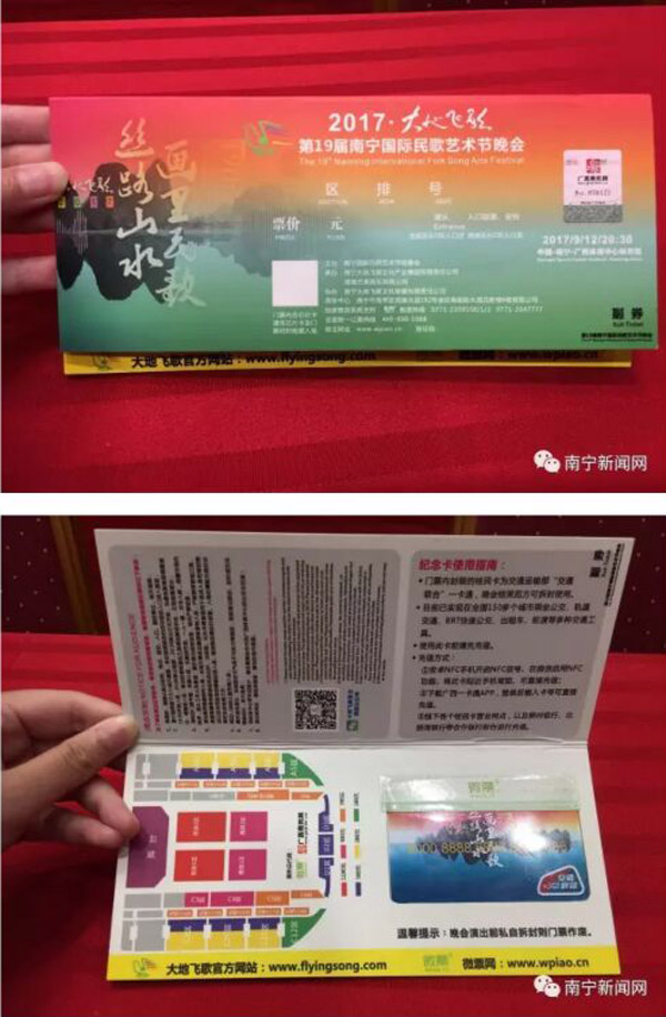 本屆民歌節(jié)晚會(huì)門票由電子票卡及紙質(zhì)票證兩部分構(gòu)成,每張紙質(zhì)票證對(duì)應(yīng)唯一的一張電子票卡,觀眾入場(chǎng)時(shí)須憑整套門票(電子卡票+紙質(zhì)票證)驗(yàn)票方可進(jìn)場(chǎng)。電子票卡為限量發(fā)行的自助交通桂民卡,該卡中所含的電子芯片不僅大大提升了門票的防偽功能,看完晚會(huì)后觀眾只要給桂民卡充值,就能夠使用該卡在全國(guó)150多個(gè)城市乘坐公共交通工具,極具實(shí)用和收藏價(jià)值。