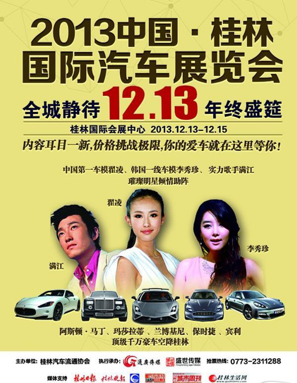 本次展會將秉承全國各大車展之特色,匯集眾多知名廠商,共同打造桂林2013年集專業(yè)性、觀賞性于一身的高端會展活動。眾多有信譽、有口碑、有知名度的行業(yè)廠商鼎力巨獻。